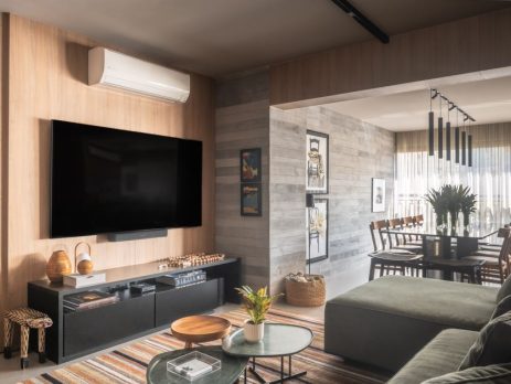 As cortinas blackout são uma ótima opção para quem tem problemas na hora dormir ou apenas não gosta do reflexo da luz na televisão no meio do filme. A escolha é versátil e eficaz para quem busca conforto e funcionalidade sem abrir mão do estilo | Projeto da Dantas & Passos Arquitetura | Foto: Henrique Ribeiro